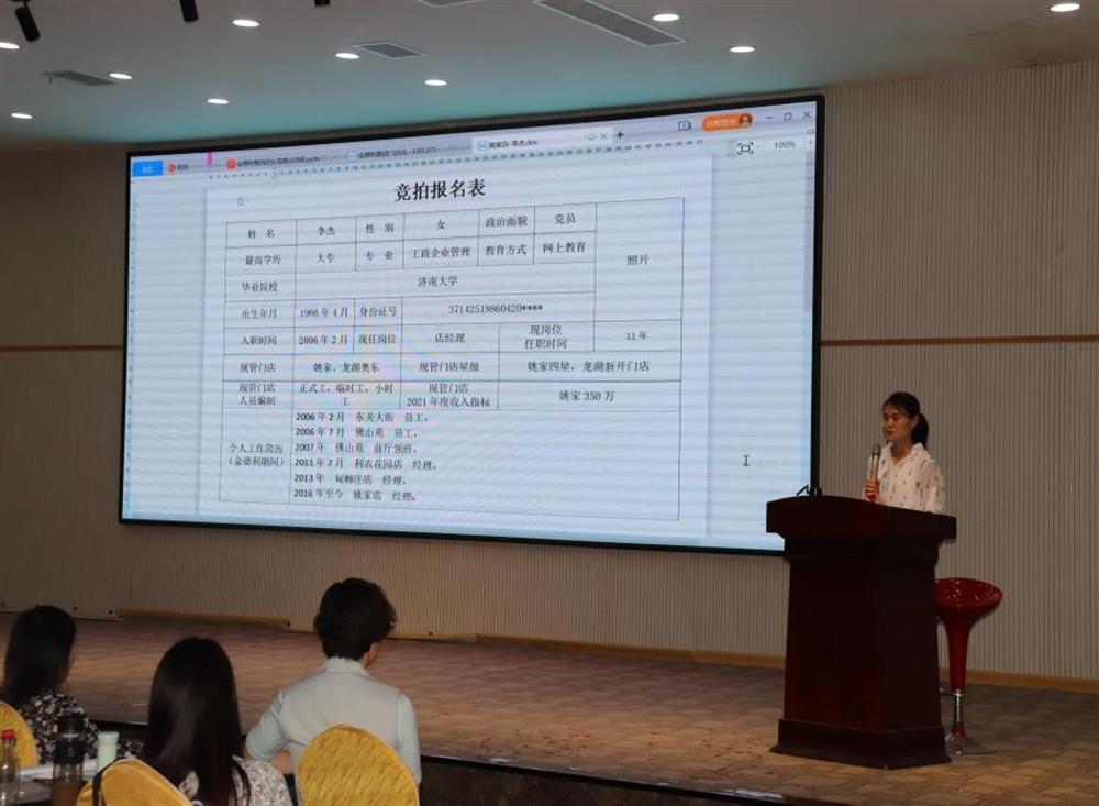 公司成立競拍領(lǐng)導(dǎo)小組,堅持“公開競拍、平等競爭、擇優(yōu)錄取、注重實績”的原則,鼓勵員工毛遂自薦、積極報名。競拍店長依次上臺分別從管理門店2021年度經(jīng)營收入目標(biāo)、競拍上崗后的工作思路、設(shè)想及經(jīng)營措施等方面進(jìn)行演講。